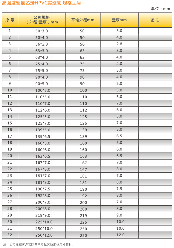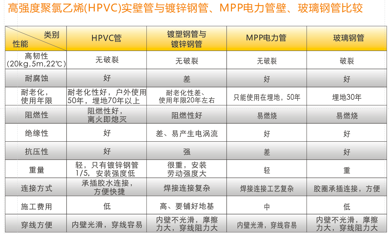 高強度聚氯乙烯(HPVC)實壁管具有高強度、高韌性、抗壓強、阻燃性好、耐腐蝕等特點。產品可代替鍍塑或鍍鋅鋼管,橫穿馬路或穿越橋梁作為通信電纜保護管,可代替MPP、PE管用于非開挖管道。